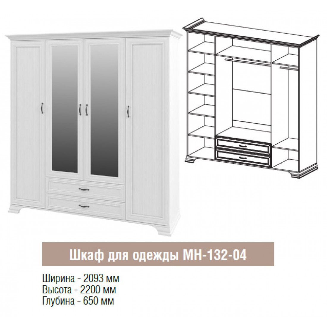 Четырехстворчатый шкаф для одежды Юнона МН-132-04 с зеркалом